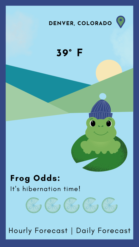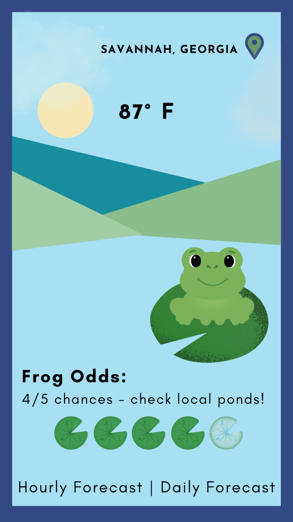 Frog Forecast: A weather app where cartoon frogs tell you about the weather and share the chances of seeing frogs in your area! Here are some of the digital assets for the app.
